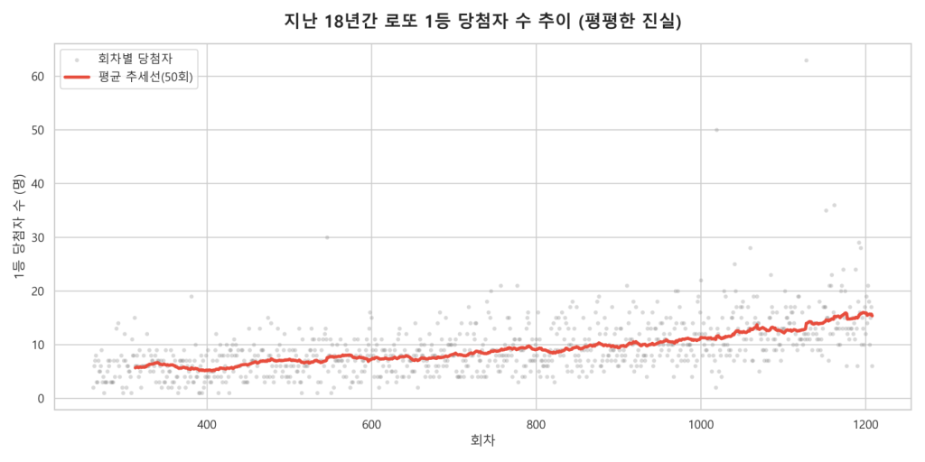 보이시나요? 붉은색 실선(평균적인 당첨자 수)을 보면 2007년 약 6명에서 시작해 2026년 현재 약 13~14명 수준으로 매우 완만하게 우상향했습니다.