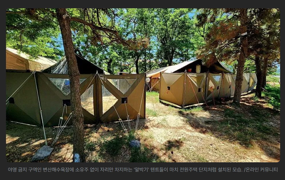 경치 좀 좋다 싶은 곳은 이미 장박 텐트(알박기)들이 점령했다. 그 사이를 비집고 들어가 봐야 옆 텐트 코 고는 소리, 술 먹고 떠드는 소리에 스트레스만 받는다. 게다가 최근엔 지자체들이 이런 곳들을 집중 단속하고 폐쇄하고 있다. 기분 좋게 놀러 갔다가 과태료 딱지 떼이고 쫓겨나기 십상이다.