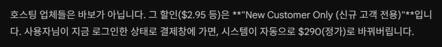 같은 회사 안에서 “신규인 척” 하려는 시도는 그들의 안방에서 도둑질하려는 것과 같다. 비싸면 협상하지 마라. 그 안에서 머리 굴리지 마라. 그냥 조용히 짐 싸서 경쟁사(Hostinger 등)로 ‘이관(Migration)’하는 것만이 방법이다.