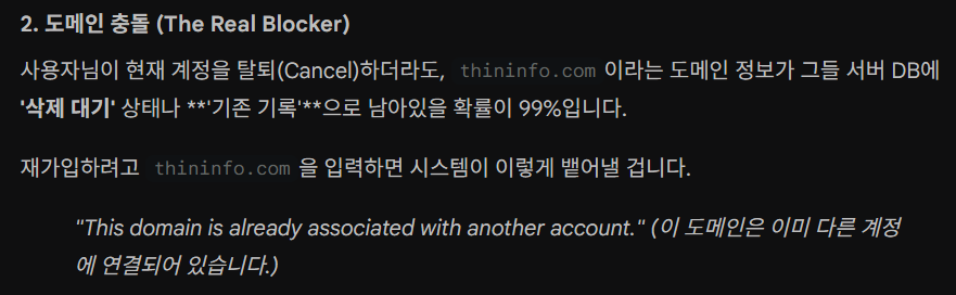 thininfo.com)이 이미 우리 회사 기존 서버에 등록되어 있는데요? 이거 중복입니다. 기존 거 삭제하고 연결할까요? 아니면 임시 도메인으로 열어드릴까요? 아, 참고로 혹시 실수로 샀다고 취소하시면 10% 위약금 떼고 환불해 드립니다.“